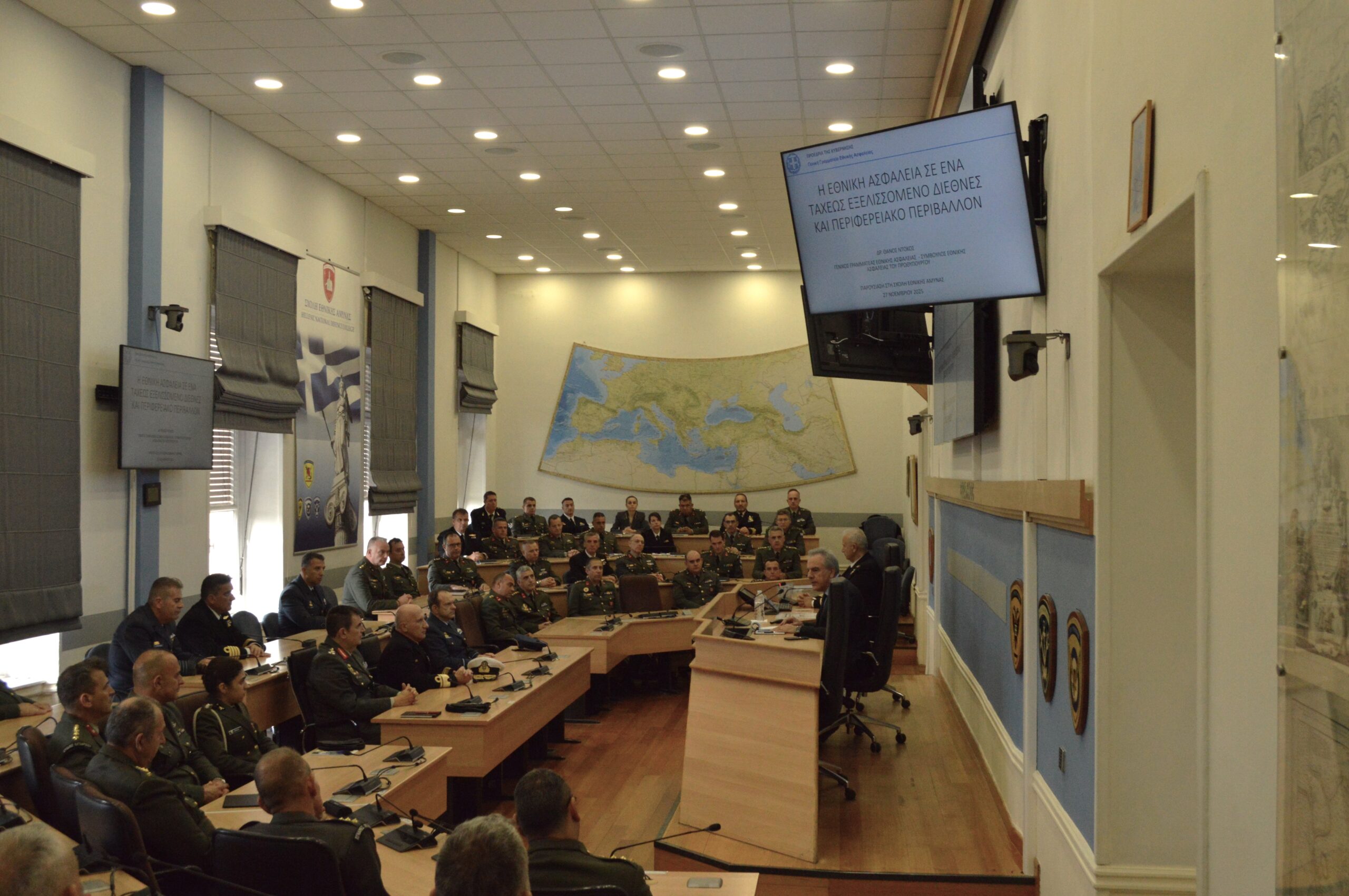 Την Πέμπτη 27 Νοε 25, επισκέφθηκε τη Σχολή Εθνικής Άμυνας ο Γενικός Γραμματέας Εθνικής Ασφάλειας της Προεδρίας της Κυβέρνησης, Δρ. Αθανάσιος Ντόκος, ο οποίος πραγματοποίησε ομιλία στους σπουδαστές της 78ης Εκπαιδευτικής Σειράς Φοίτησης, με θέμα «Η εθνική ασφάλεια σε ένα ταχέως εξελισσόμενο διεθνές και περιφερειακό περιβάλλον».