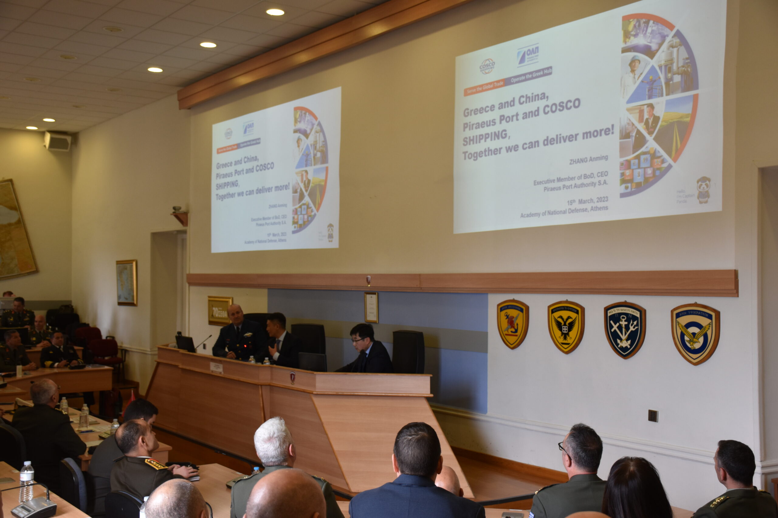 Την Τετάρτη 15 Μαρ 23, επισκέφθηκε τη Σχολή Εθνικής Άμυνας ο Διευθύνων Σύμβουλος του ΟΛΠ Α.Ε. κ. Zhang Anming, ο οποίος πραγματοποίησε ομιλία στους σπουδαστές της 75ης Ε.Σ. ΦΔΠ με θέμα «Greece and China, Piraeus Port and COSCO SHIPPING, Together we can deliver more».